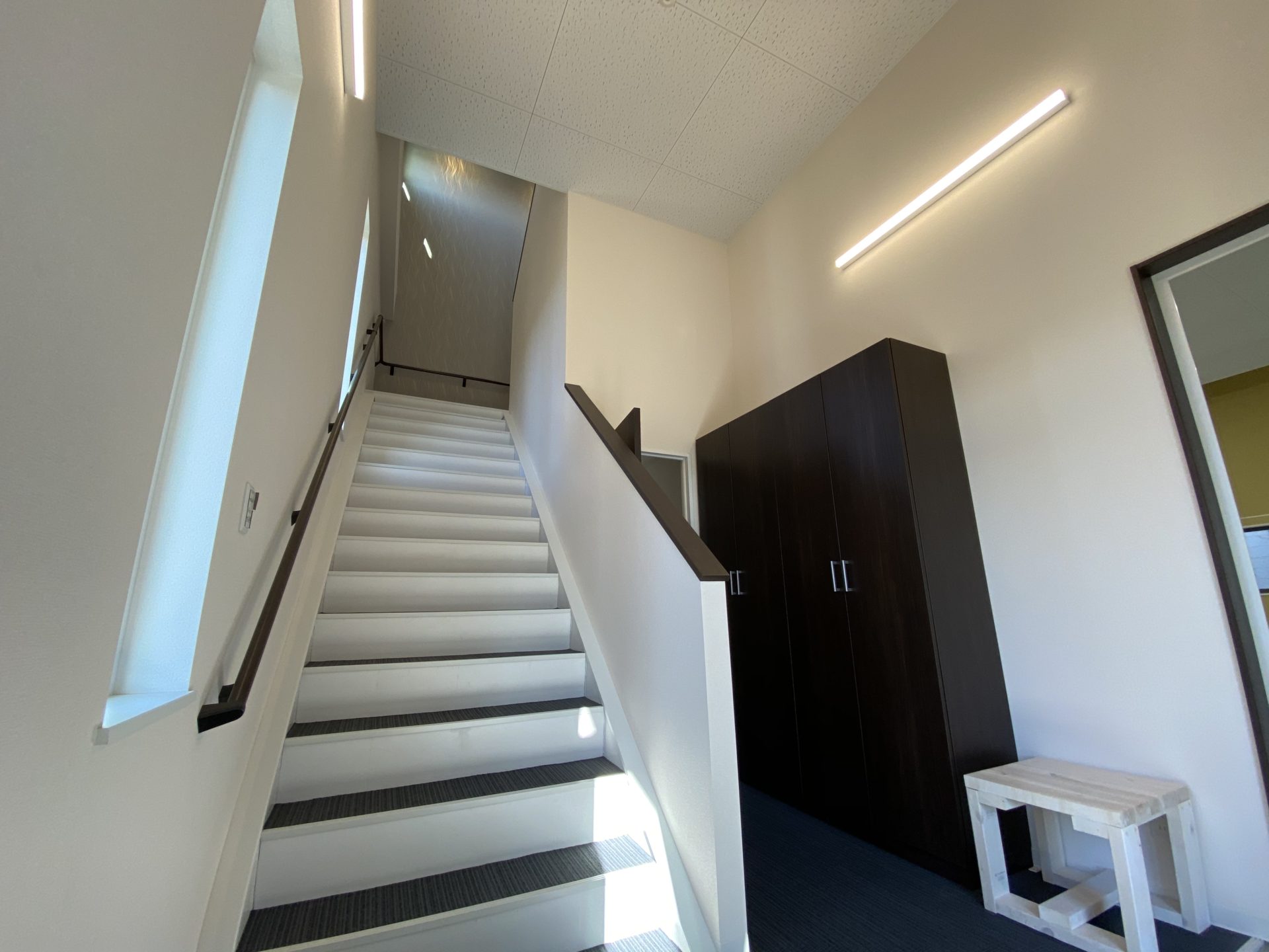 内部工事:内部倉庫の一部をガレージスペースへ変更、倉庫床塗装・天井、壁ボード貼替、2Fスラブ下断熱吹付、内部全体を躯体残しとし、間仕切り変更、壁天井のボード貼り、内装仕上げ工事、エアコン新設、キッチン及び洗面化粧台、便器等交換させて頂きました。